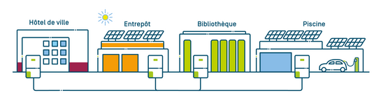 - Une commune a installé des panneaux solaires sur le toit de sa piscine et de son entrepôt et partage le surplus d'énergie autoproduite avec la mairie et la bibliothèque où les panneaux solaires n'ont pas (encore) été installés.