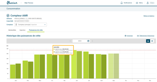 Actuellement, pour les compteurs numériques, Mijn Fluvius n'indique que la puissance de crête prélevée, et non de l'injection. Les clients disposant d'un compteur AMR au lieu d'un compteur numérique ordinaire verront à la fois la puissance de crête du prélèvement et de l'injection, pour l'électricité comme pour le gaz.
