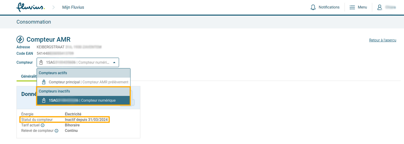 Un compteur inactif est un compteur d'énergie qui était actif mais qui a été retiré ou remplacé depuis. Toutefois, les données sauvegardées de ces compteurs numériques ou AMR inactifs restent disponibles. Sur Mijn Fluvius, vous les trouverez dans le menu déroulant sous « Compteur » sous « Compteurs inactifs ». Pour savoir quand le compteur est devenu inactif, sélectionnez le compteur inactif et consultez l'onglet « Général ».
