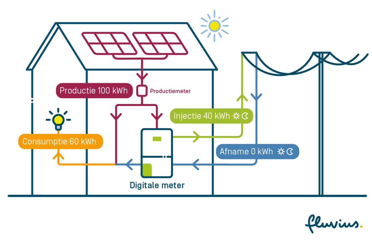 Dans l'exemple ci-dessous, les panneaux photovoltaïques ont produit 100 kWh. Sur ce total, 60 kWh ont été immédiatement utilisés par des appareils ménagers (autoconsommation simultanée). Les 40 kWh restants ont été injectés dans le réseau. Dans ce cas, Mijn Fluvius n'affichera donc que les 40 kWh d'énergie injectée. Vous avez un compteur AMR avec un compteur de production séparé pour vos panneaux photovoltaïques ? Vous pourrez alors accéder à ces données sur Mijn Fluvius, à condition que le compteur de production ait été installé par Fluvius et non par un tiers.
