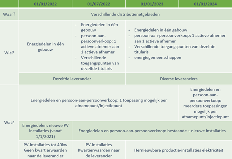 Fluvius est favorable à une séparation stricte entre le niveau physique (réseau) et le niveau du marché où s'effectuent les règlements nécessaires des volumes d'énergie et des tarifs. En ce sens, il n'est donc pas nécessaire d'adapter la manière dont la construction ou le raccordement du réseau est effectué. En effet, Fluvius souhaite également permettre le partage d'énergie et la vente de personne à personne sur les réseaux existants. Cependant, tous les participants aux programmes de partage de l'énergie et de vente de personne à personne doivent disposer d'un compteur numérique dont la lecture est trimestrielle.