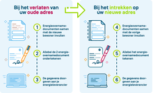Vous devez le faire pour que le fournisseur d'énergie puisse établir une facture finale pour votre ancienne adresse et commencer à facturer à votre nouvelle adresse. Pour ce faire, vous devez fournir les relevés du ou des compteurs de votre ancienne adresse et les relevés du ou des compteurs de votre nouvelle adresse via het le document de reprise d'énergie.. (Document sur la reprise de l'énergie pour les prosommateurs)