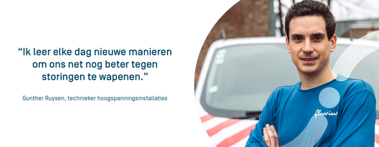 Ook Gunthers vader werkt bij Fluvius. “Al 25 jaar. Hij zorgt er mee voor dat ons net niet overbelast raakt wanneer zonnepanelen te veel spanning geven op een zonnige dag. Of omgekeerd, wanneer verbruikers te veel stroom vragen. Ik heb elektromechanica gevolgd in het middelbaar. Toen ik een stageplaats zocht, was Fluvius een logische keuze. Tijdens die stage heb ik al op veel diensten meegelopen – ook die waar ik nu werk – en de interesse was meteen gewekt. Maar ik wou nog verder studeren.”