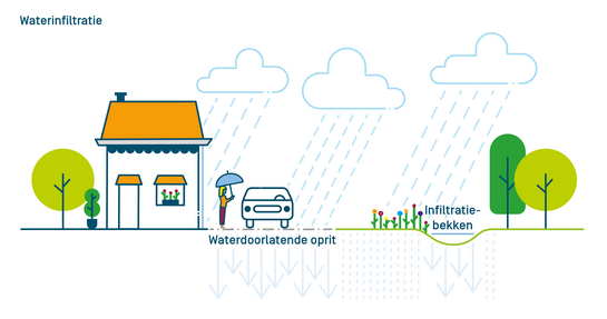 Als we bij zware regenval al dat hemelwater meteen afvoeren naar de riolering, kan het riool die hoeveelheid water niet aan. Door het water te laten infiltreren, ontlasten we de riolen en verminderen we ook de kans op wateroverlast in straten, tuinen en kelders.