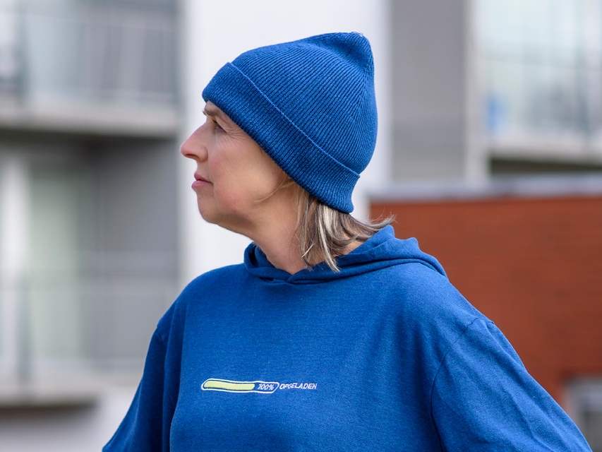 Vandaag is een deel van de kledij verwerkt tot een reeks nieuwe, circulaire kledingstukken voor onze medewerkers: hoodies, mutsen en sjaals. Die kledij verkopen we aan onze medewerkers in het kader van onze eindejaarsactie. De opbrengst daarvan schenken we aan de Voedselbanken.