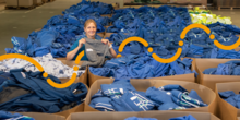 Vandaag is een deel van de kledij verwerkt tot een reeks nieuwe, circulaire kledingstukken voor onze medewerkers: hoodies, mutsen en sjaals. Die kledij verkopen we aan onze medewerkers in het kader van onze eindejaarsactie. De opbrengst daarvan schenken we aan de Voedselbanken.