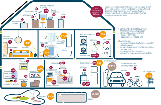 Hieronder zie je hoeveel bepaalde toestellen in een gezinswoning gemiddeld verbruiken op jaarbasis.