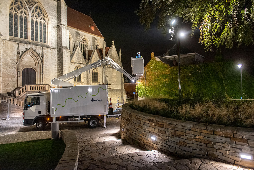 Technieker van Fluvius herstelt een defecte straatverlichting