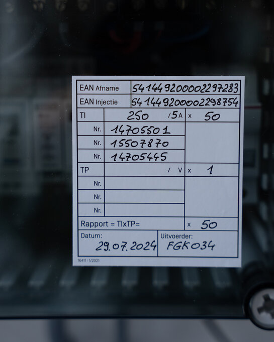 - Op de meterkast staat een sticker met de verhouding van de meettransformator (TI x TP). Als de TI verhouding bijvoorbeeld 50:5 (= 10) is, en de TP verhouding 15 400:110 (= 140), moet je de waarde op het display vermenigvuldigen met 1 400 (10 x 140).