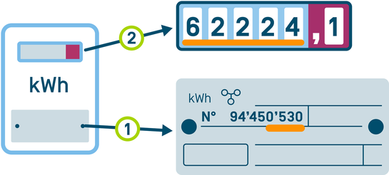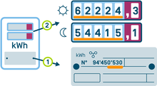 - Stap 2: bij een tweevoudige meter heb je twee meterstanden: een voor je dagverbruik en een voor je nachtverbruik. We hebben enkel de cijfers voor de komma nodig. In ons voorbeeld is de dagmeterstand gelijk aan 62224 en de nachtmeterstand 54415. Die cijfers moet je doorgeven aan Fluvius.