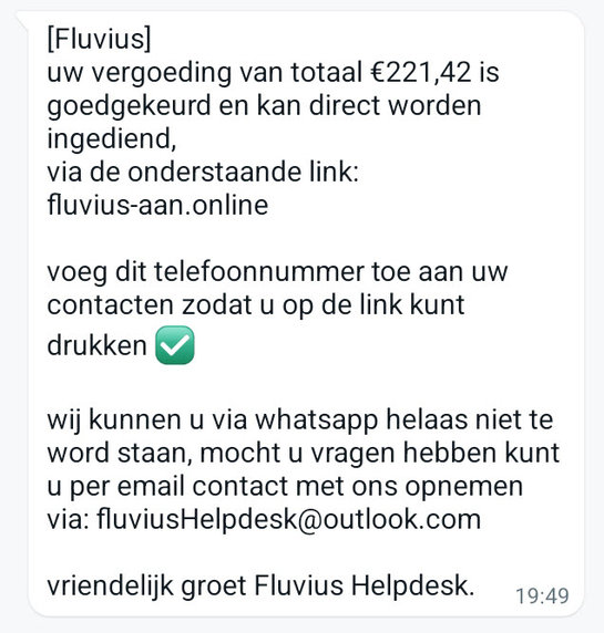 Phishers proberen van jou geld of informatie te krijgen door het sturen van sms of Whatsapp-berichten in naam van Fluvius. Ze willen dat je op de link klikt en dan bepaalde handelingen uitvoert die ervoor zorgen dat ze toegang krijgen tot je gegevens of bankapp.