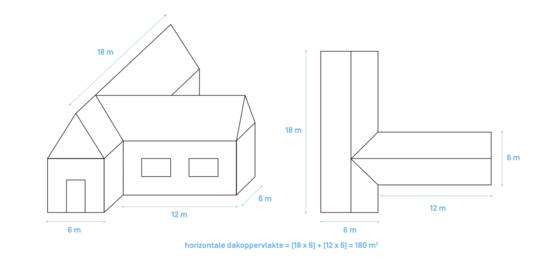 De horizontale dakoppervlakte bereken je door je dak van bovenaf te bekijken en dan de oppervlakte te berekenen. Je houdt dus geen rekening met de hellingsgraad.