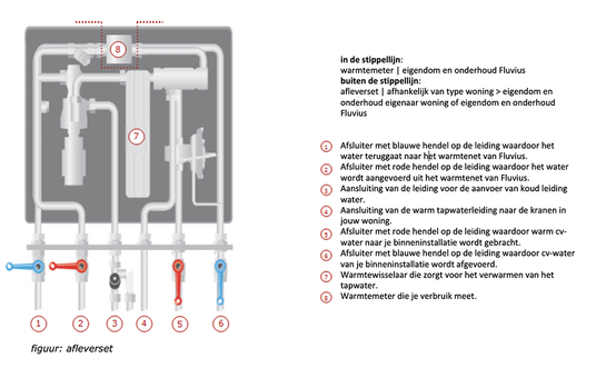 Draai alle afsluiters van je afleverset dicht en neem contact op met Fluvius op het storingsnummer voor warmte 078 35 35 37.