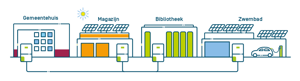 - Een gemeente heeft zonnepanelen op het dak van het zwembad en het magazijn en deelt het overschot aan zelf opgewekte energie met het gemeentehuis en de bibliotheek waar (nog) geen zonnepanelen geïnstalleerd zijn.