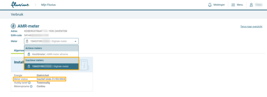 Een inactieve meter is een energiemeter die ooit actief was, maar intussen is verwijderd of vervangen. De opgeslagen gegevens van zulke inactieve digitale meters of AMR-meters blijven echter beschikbaar. Op Mijn Fluvius vind je ze in het dropdownmenu bij “Meter” onder “Inactieve meters”. Om te weten wanneer de meter inactief is geworden, selecteer je de inactieve meter en kijk je vervolgens op het tabblad “Algemeen”.
