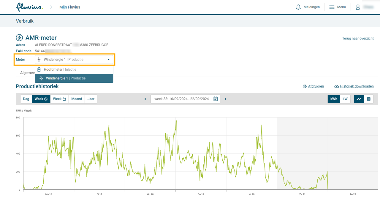 Een submeter staat in serie met een AMR-hoofdmeter en meet slechts een deel van de installatie, bijvoorbeeld enkel de productie van zonnepanelen. Om zowel de meetgegevens van de AMR-hoofdmeter als van de submeter te raadplegen, hoef je slechts één aanvraag in te dienen via Mijn Fluvius. (Je kan geen aanvraag doen voor enkel de submeter.) Nadat je aanvraag is goedgekeurd, zie je de gegevens van de submeter door die te selecteren in het dropdownmenu bij “Meter”.