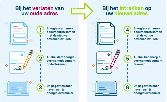 Vul samen met de nieuwe bewoner of eigenaar elk een energieovernamedocument (energieovernamedocument voor prosumenten) in, onderteken het en bewaar elk een exemplaar. Zo verzamel je alle relevante informatie en vermijd je later discussies over de juiste meterstanden. Bezorg (een kopie van) het overnamedocument aan je energieleverancier(s), zodat hij een eindafrekening kan maken voor het verbruik op het oude adres.