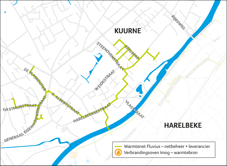 Dankzij de samenwerking tussen Fluvius, IMOG en de gemeente Kuurne wordt restwarmte omgezet in bruikbare energie voor gebouwen in het centrum. Het warmtenet levert water tot 70°C aan, bestemd voor sanitair warm water en verwarming. Hierdoor kunnen zowel nieuwe als bestaande gebouwen – waaronder het gemeentehuis, het Sociaal Huis en de gemeenteschool – binnenkort fossielvrij verwarmd worden.