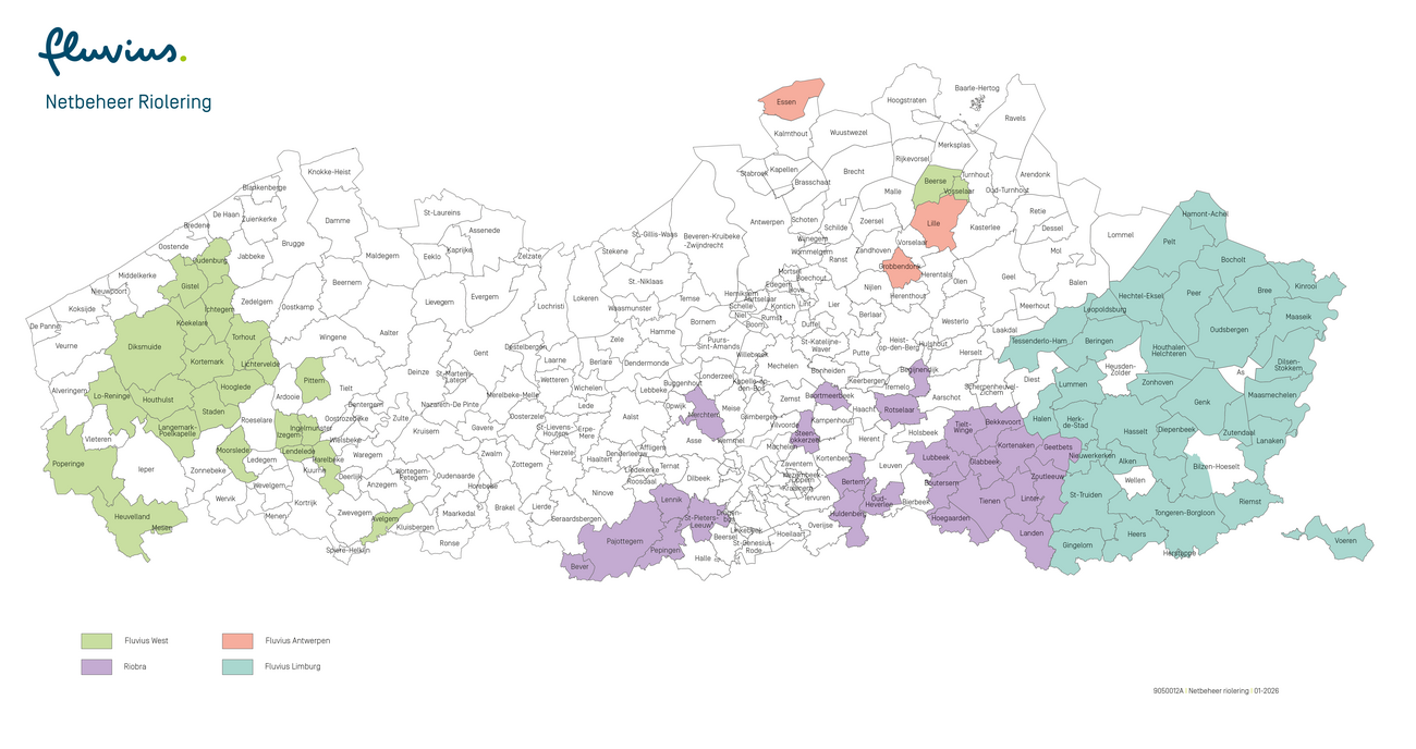 - Er zijn 4 verenigingen actief in de 100% gereguleerde rioleringsactiviteit: Fluvius Antwerpen, Fluvius Limburg, Fluvius West en Riobra.