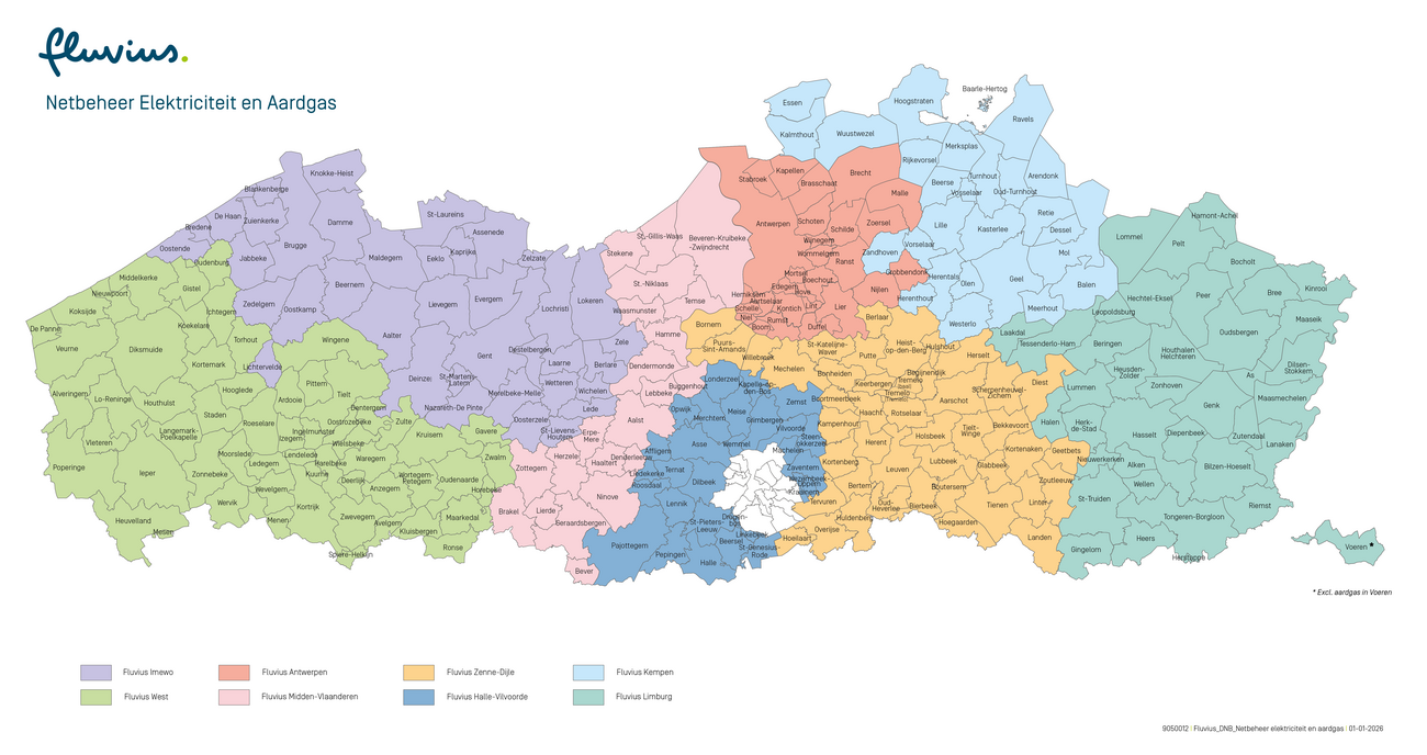 Onderstaande kaart illustreert de verdeling van de gemeenten over de verschillende netbeheerders, voor elektriciteit en aardgas, vanaf 1 januari 2026.